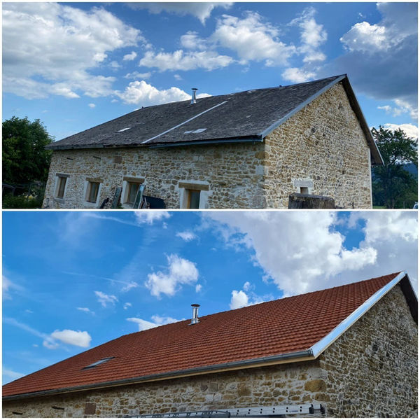 Dépose complète de la toiture existante, puis lattage et contre lattage avec pose de tuiles, chantier réalisé à Cossonod 01420.