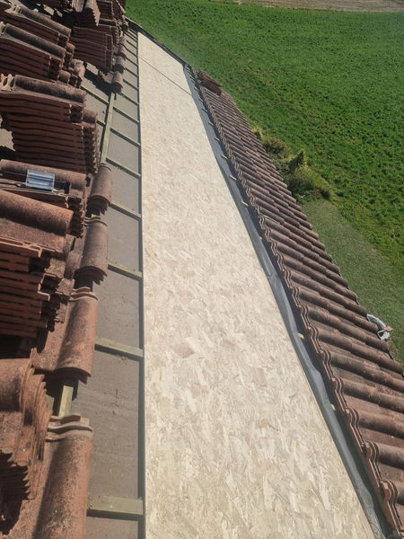 Artisan Brun, couvreur zingueur reconnu à Saint-Julien-en-Genevois et ses environs, assure la rénovation complète de toitures en tuiles à Archamps (74160). Sur ce chantier, notre équipe experte a réalisé la dépose de la couverture existante, la pose de panneaux OSB et l’installation d’un nouvel écran sous-toiture pour renforcer l’étanchéité et la protection contre les intempéries.